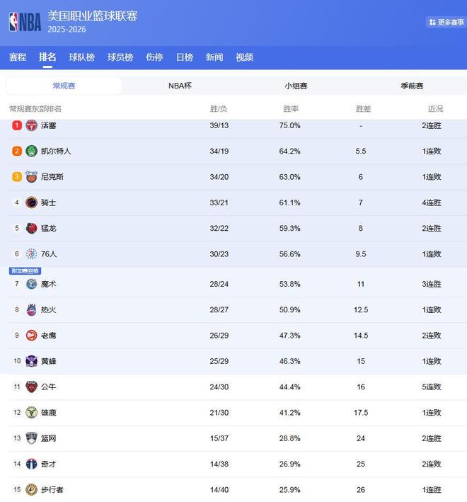 東部最新排名