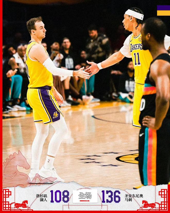 - 殘陣湖人108-136慘敗馬刺 球員評(píng)價(jià):4人良好,2人及格,6人低迷
