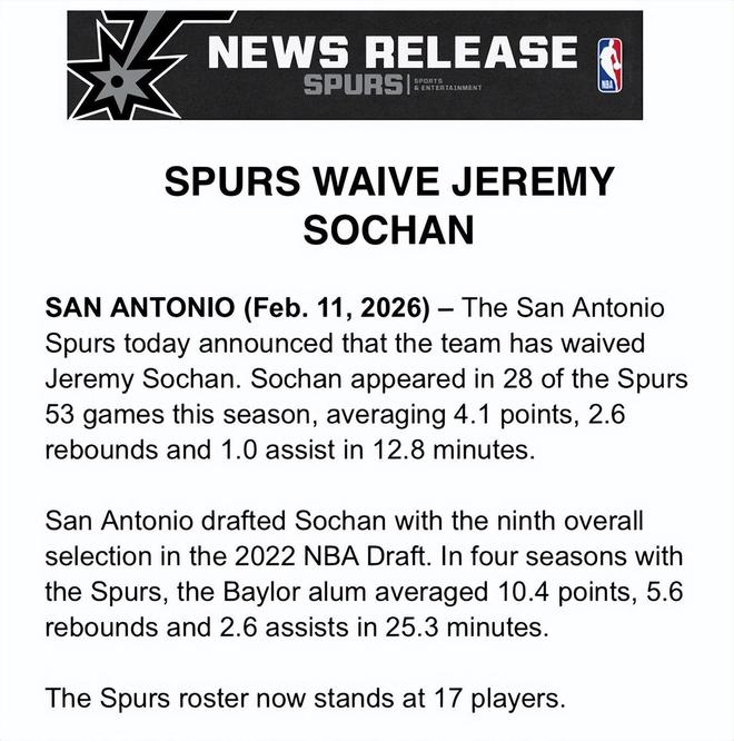 北京時間2月12日,圣安東尼奧馬刺隊官方宣布,球隊已裁掉杰里米-索漢。本賽季,索漢代表馬刺出戰(zhàn)了53場比賽中的28場,場均登場12.8分鐘,得到4.1分、2.6個籃板和1.0次助攻。