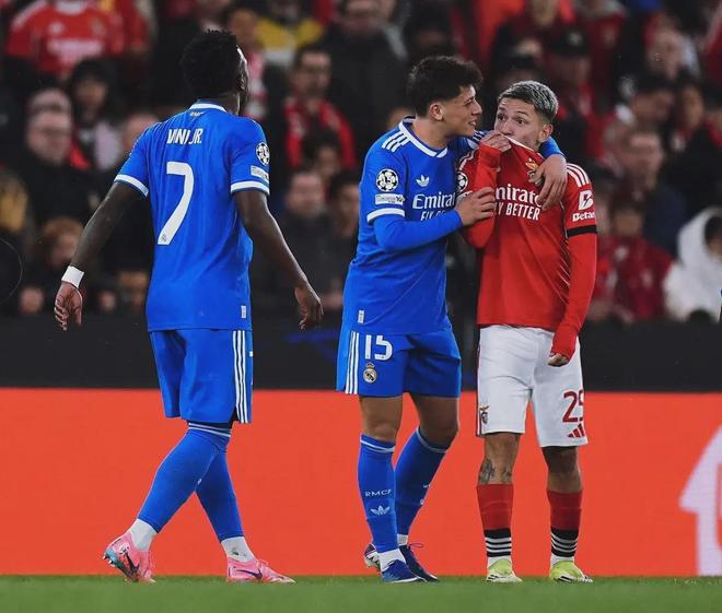 更荒誕的劇情還在上演:補時階段,阿根廷世界杯冠軍成員奧塔門迪竟然向維尼修斯亮出了自己的冠軍紋身,兩人相視而笑——這是挑釁?是嘲諷?還是一種詭異的“尊重”?而在球員通道外,本菲卡主席魯伊·科斯塔甚至被曝與皇馬工作人員發(fā)生肢體沖突。
