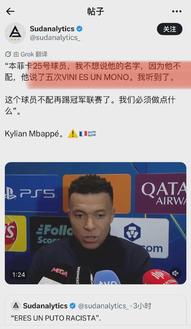 正方: 姆巴佩賽后面對鏡頭擲地有聲:“我親耳聽到了,對方25號球員先后叫了維尼修斯5次‘猴子’?!边@不僅是隊友的聲援,更是將歧視坐實的致命一擊。維尼修斯在替補席上的憤怒與無奈,看臺上飛來的電子煙和雜物,似乎都在佐證這并非空穴來風。